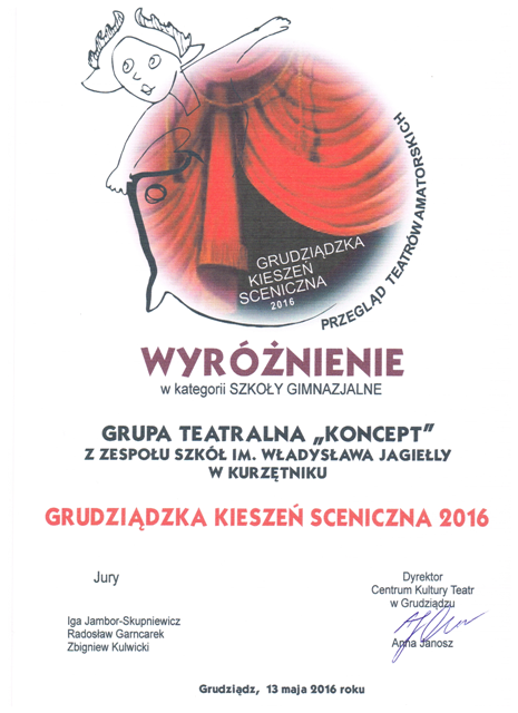Grudziądzka Kieszeń Sceniczna to impreza o zasięgu regionalnym, organizowana z myślą o amatorskich grupach teatralnych działających w ośrodkach kultury oraz przy szkołach. W tym roku po raz pierwszy w przeglądzie wzięła udział grupa teatralna „Koncept” z Zespołu Szkół im. Władysława Jagiełły w Kurzętniku prowadzona przez panią Alinę Kowalczyk. Grupa w składzie: Karolina Wiśniewska, Jagoda Aranowska, Liwia Piotrowicz, Kacper Wardowski i Przemysław Garbicz zaprezentowała przedstawienie pt.”Legenda o rycerzu lutniarzu” i otrzymała wyróżnienie w kategorii: szkoły gimnazjalne. Dodatkowym uhonorowaniem grupy był występ na gali wręczenia nagród.