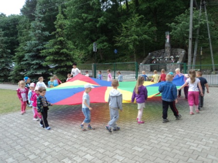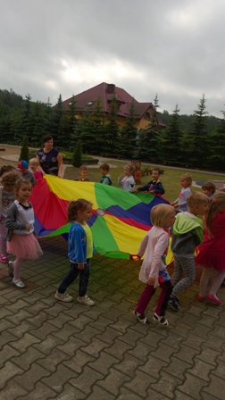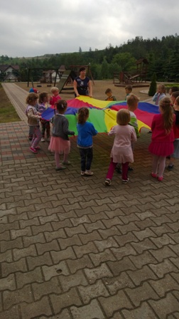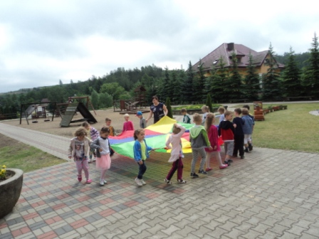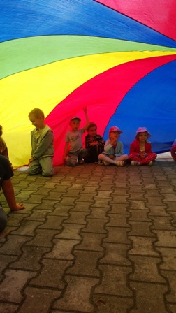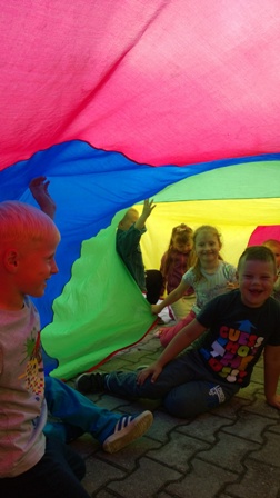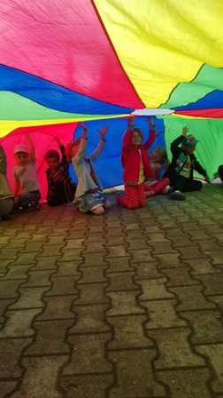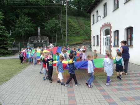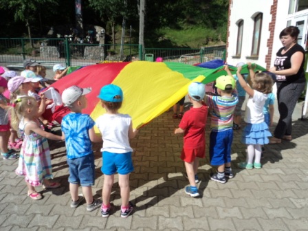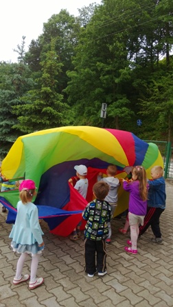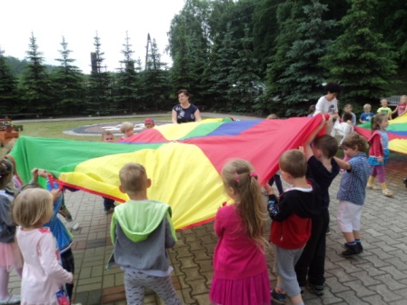 Początek czerwca to czas wyjątkowo lubiany przez wszystkie dzieci. Również nasze przedszkolaki z radością świętowały swój dzień − Dzień Dziecka . W tym uroczystym dniu rozbrzmiewała wesoła muzyka zapraszająca do tańca. Dzieci miały możliwość realizowania swojego talentu muzycznego na placu przedszkolnym. Bardzo dużym zainteresowaniem wśród dzieci cieszyła się chusta animacyjna.