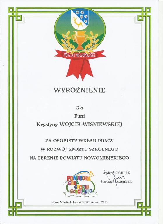 Dodatkowo za osobisty wkład pracy w rozwój sportu szkolnego na terenie powiatu nowomiejskiego okazały puchar i dyplom otrzymała pani dyrektor Krystyna Wójcik Wiśniewska.