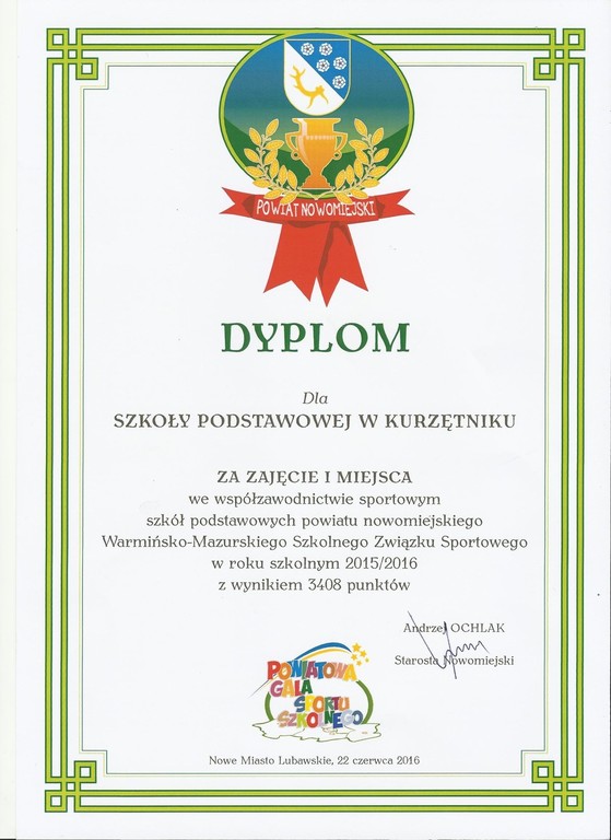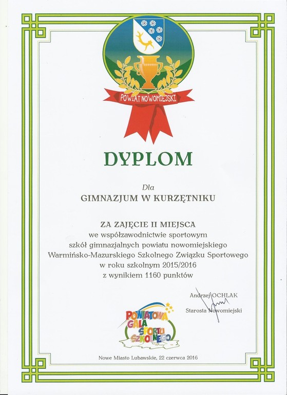 Dnia 22 czerwca odbyła się I Powiatowa Gala Sportu Szkolnego. Kapituła podsumowała bieżący rok szkolny we współzawodnictwie sportowym szkół podstawowych i gimnazjalnych w powiecie nowomiejskim. Kurzętnicka szkoła podstawowa zajęła I miejsce natomiast gimnazjum II. Dodatkowo z rąk Starosty Powiatowego Andrzeja Ochlaka uczniowie wyróżnieni otrzymali nagrody rzeczowe. Poniżej przedstawiamy uczniów naszej szkoły, którzy zajęli wysokie miejsca w ogólnej punktacji.