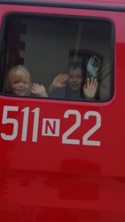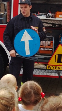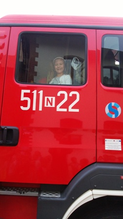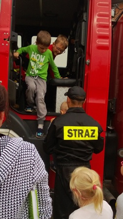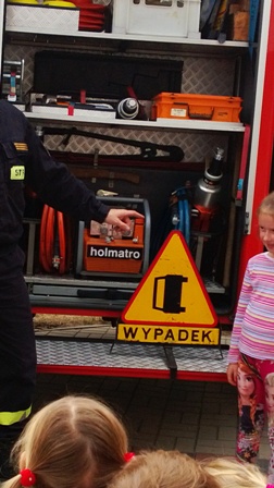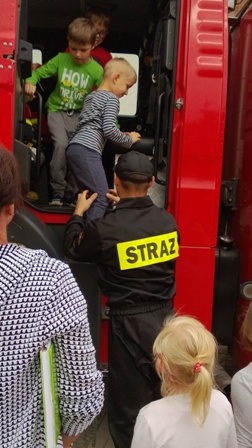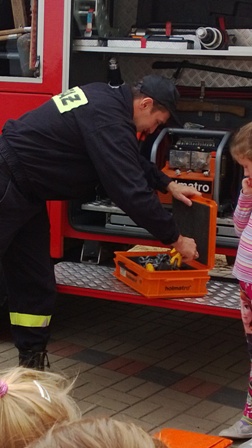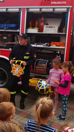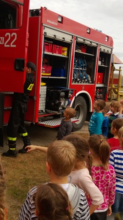 Największe zainteresowanie wzbudził wóz strażacki, którym przyjechali nasi goście. Strażacy zademonstrowali wyposażenie wozu strażackiego, między innymi: gaśnice, węże, sprzęt służący do pomocy podczas wypadków. Ogromną atrakcją okazał sie pokaz użycia sprzętu gaśniczego.