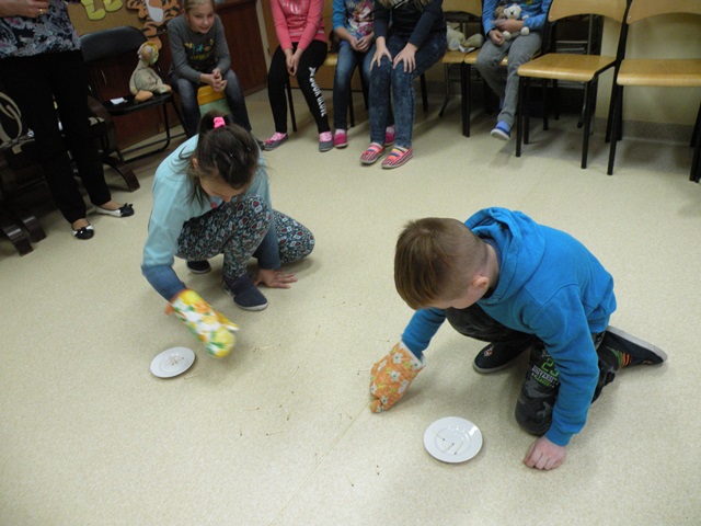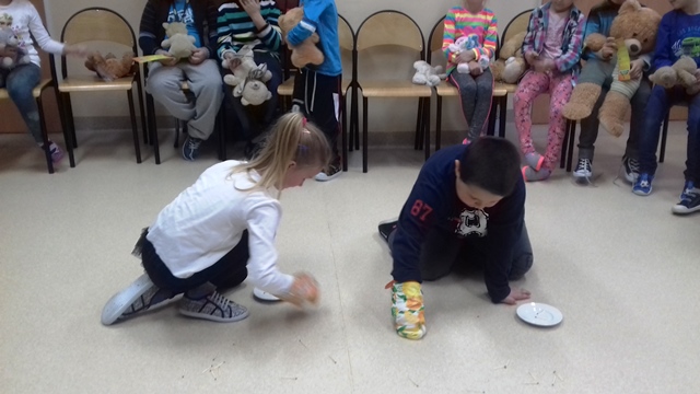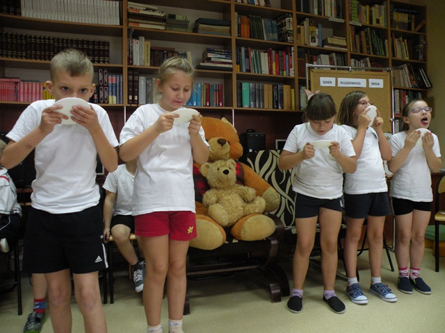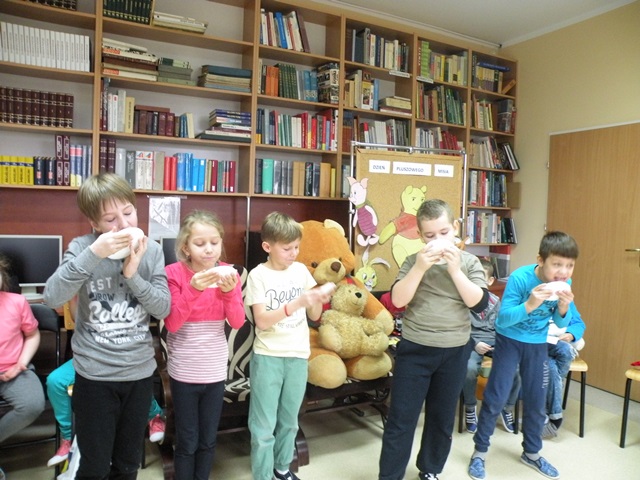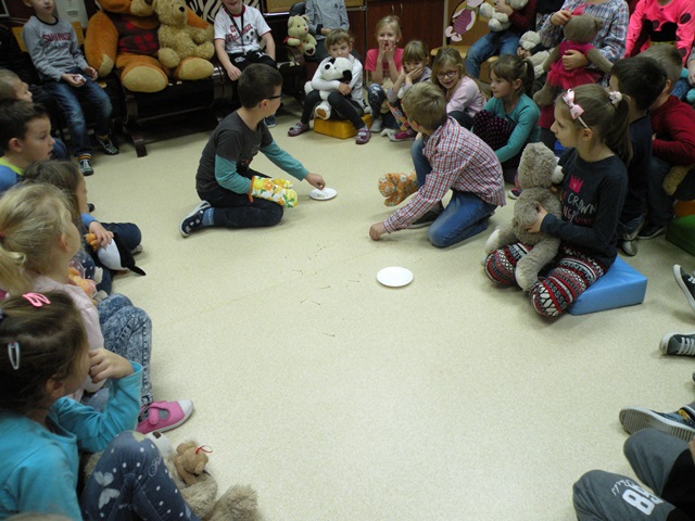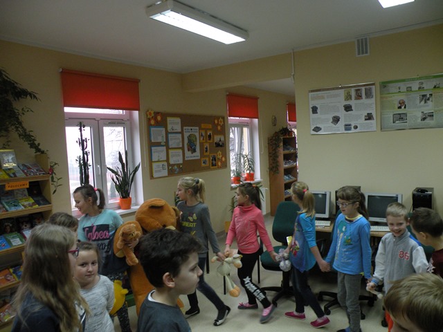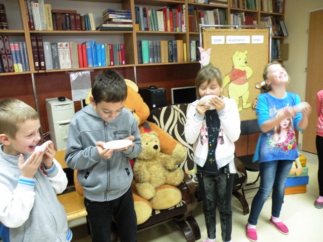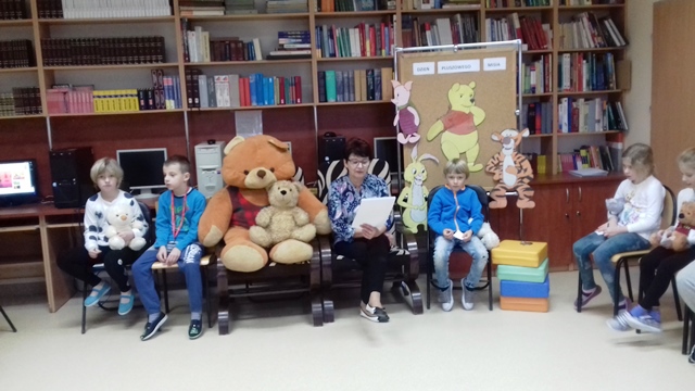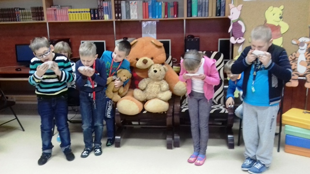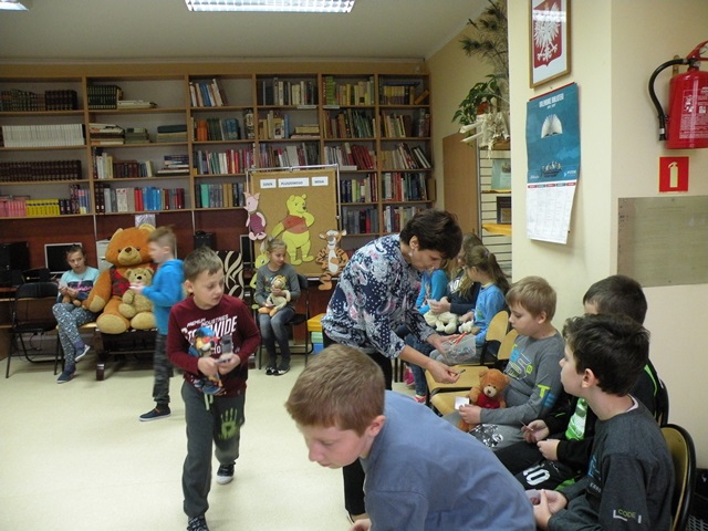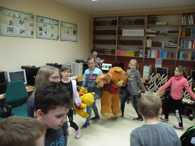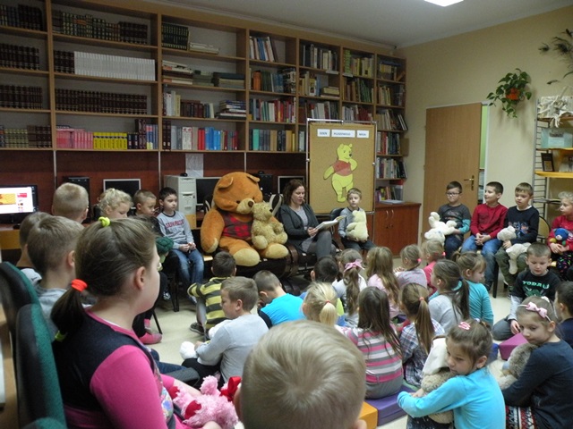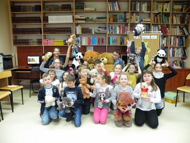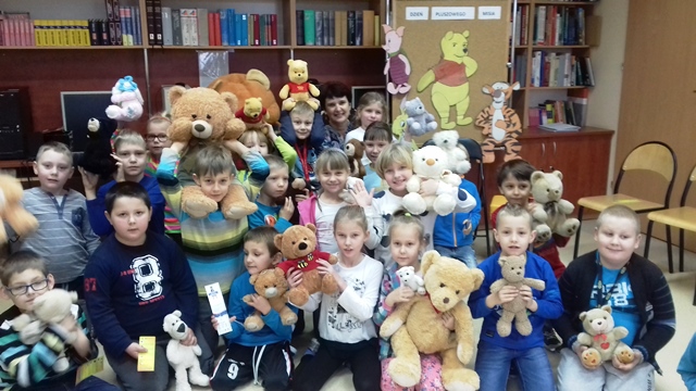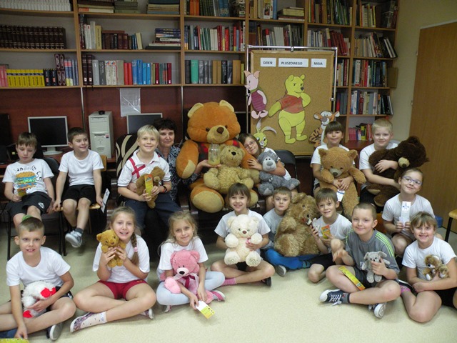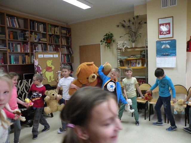 Tego dnia każde dziecko przyszło do szkoły ze swoim małym lub dużym przyjacielem - Misiem. W bibliotece szkolnej pani Małgosia przygotowała dla dzieci sporo niespodzianek. Najpierw odczytała informacje o niedźwiedziach. Po wysłuchaniu tekstu należało odpowiedzieć na pytania. Następnie chętne dzieci wzięły udział w konkursie, który polegał na szybkim zlizaniu miodu z talerzyka. W kolejnej konkurencji należało zebrać rękawicą kucharską rozrzucone zapałki. Jak to w bibliotece nagrodami były zakładki do książek. Na zakończenie wizyty dzieci zatańczyły ze swoimi pluszakami.