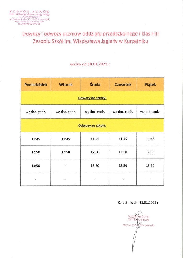 DOWOZY I ODWOZY UCZNIÓW ODDZIAŁÓW PRZEDSZKOLNYCH I KLAS I-III OD 18.01.2021