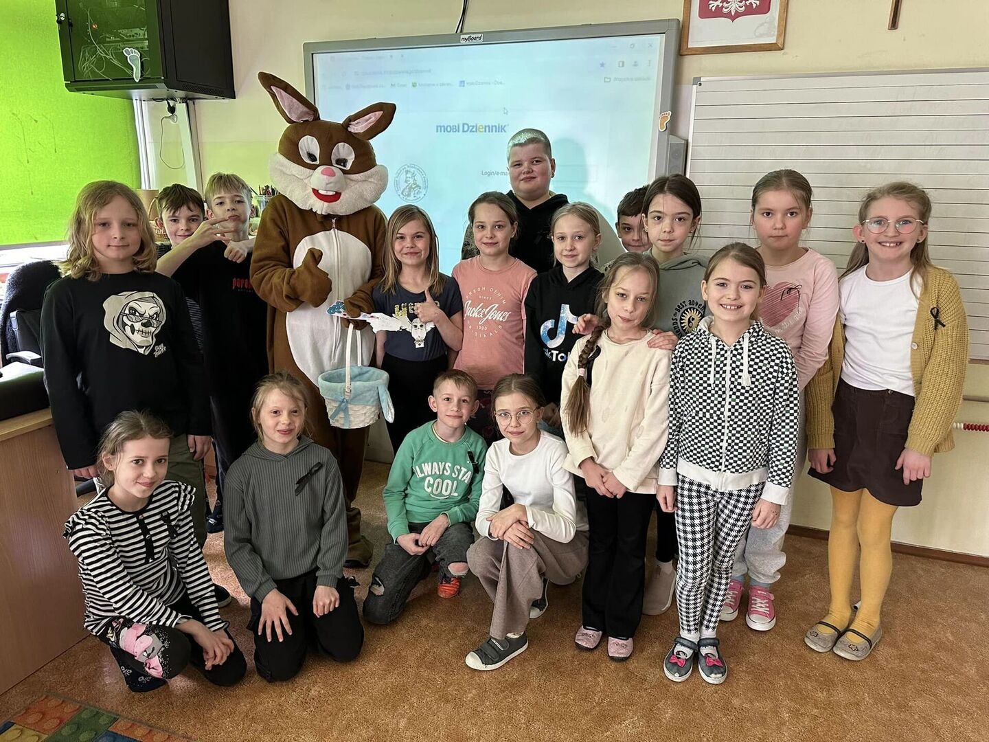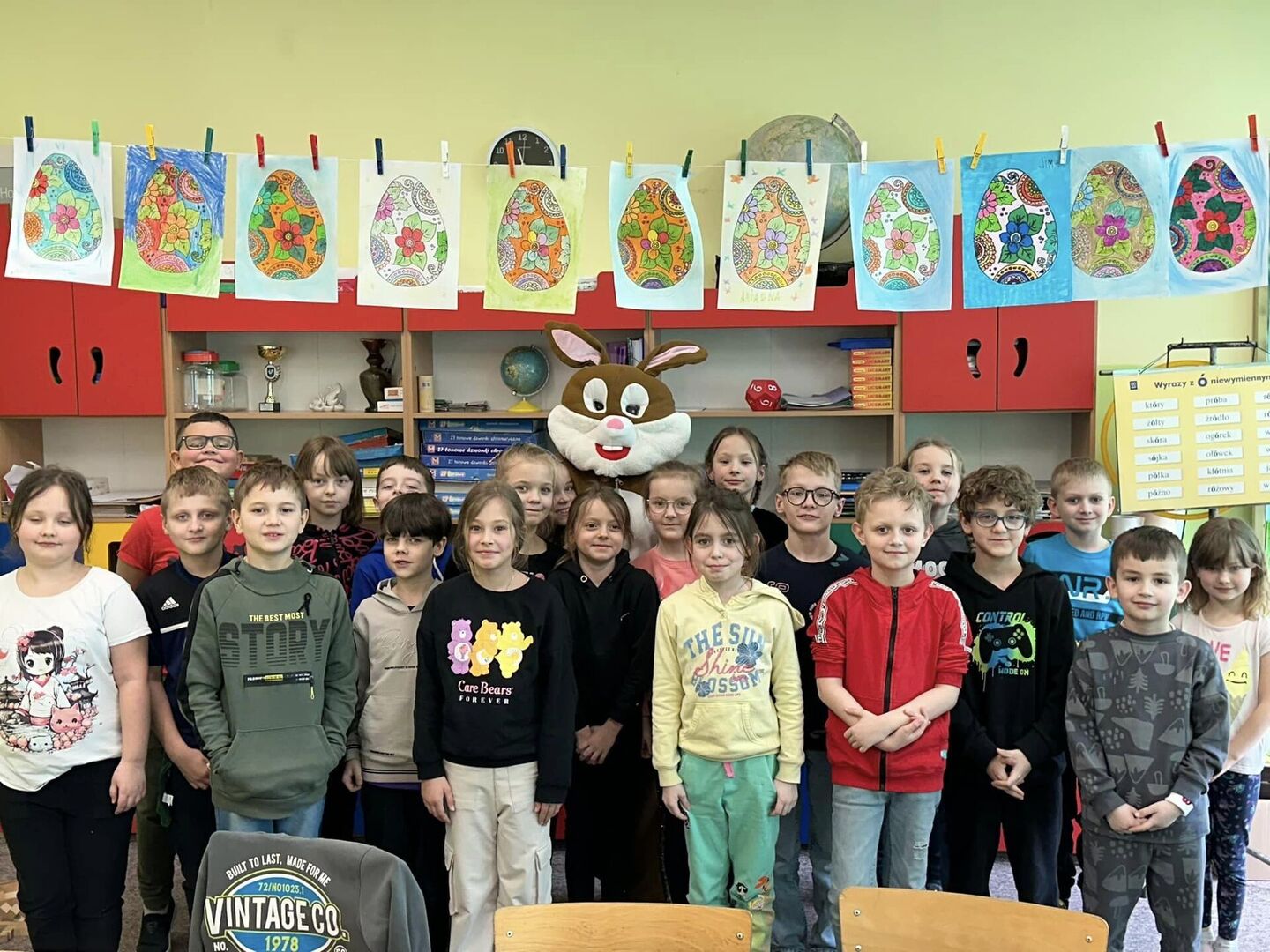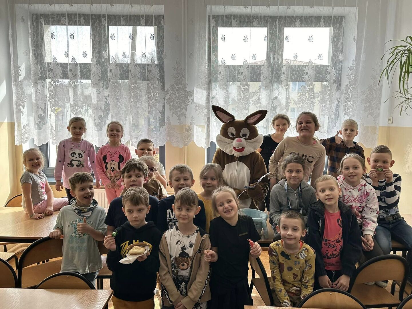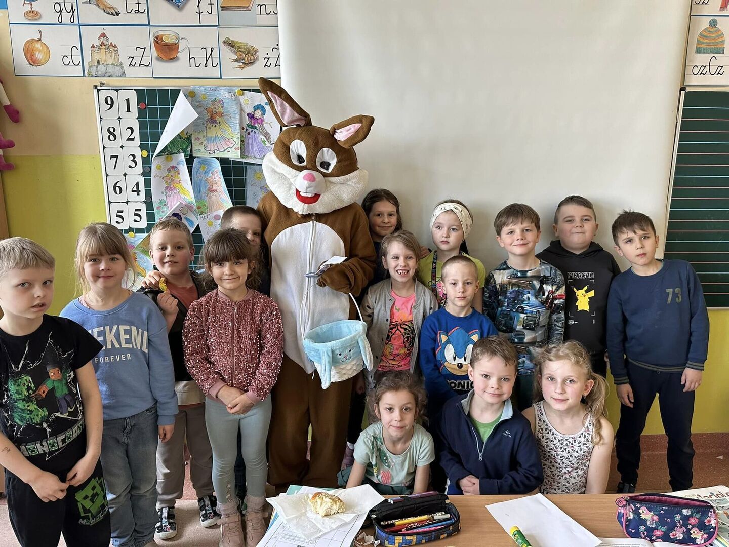 Już od dawna w naszym przedszkolu i szkole podstawowej panuje świąteczny klimat, dzięki deokracjom w klasach oraz zajęciom poświęconym tematyce Świąt Wielkanocnych. Jednak dzisiaj w murach naszej szkoły pojawił się wspaniały gość "Zajączek Wielkanocny"