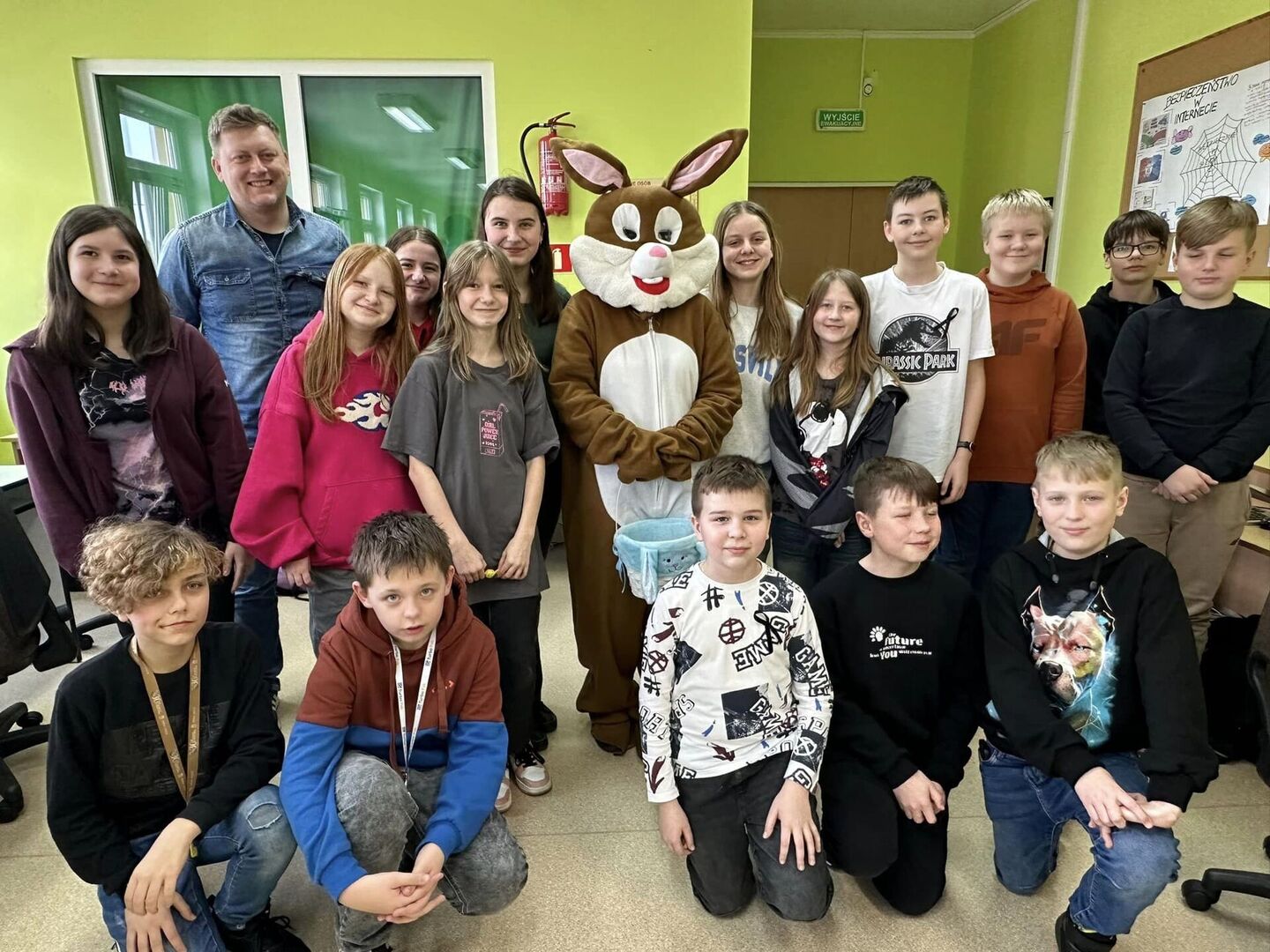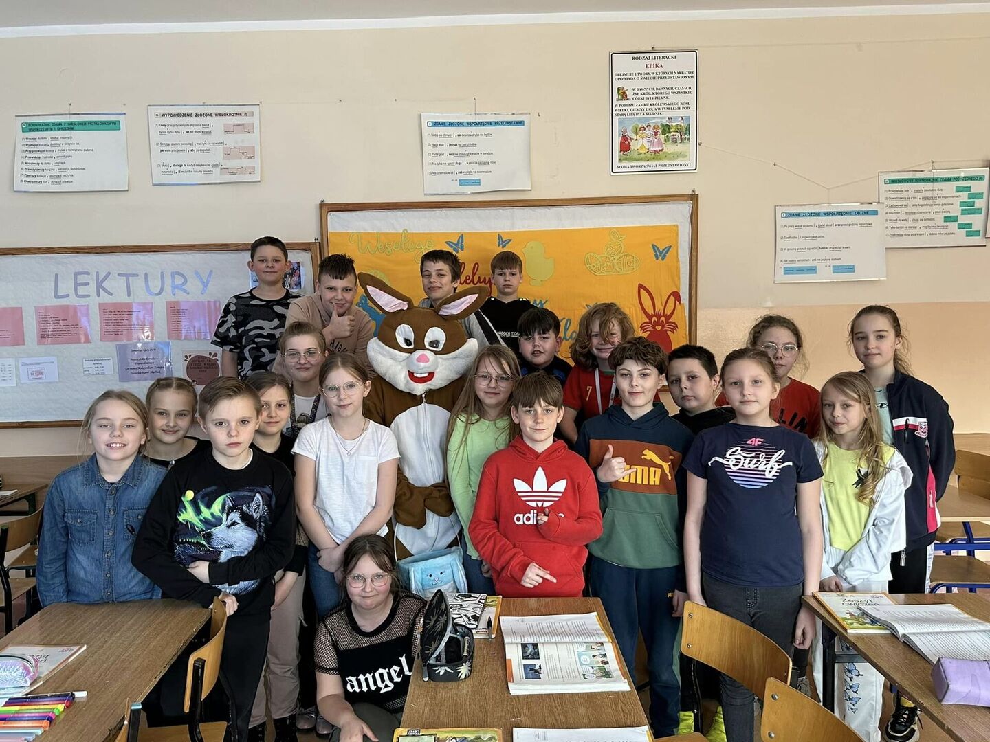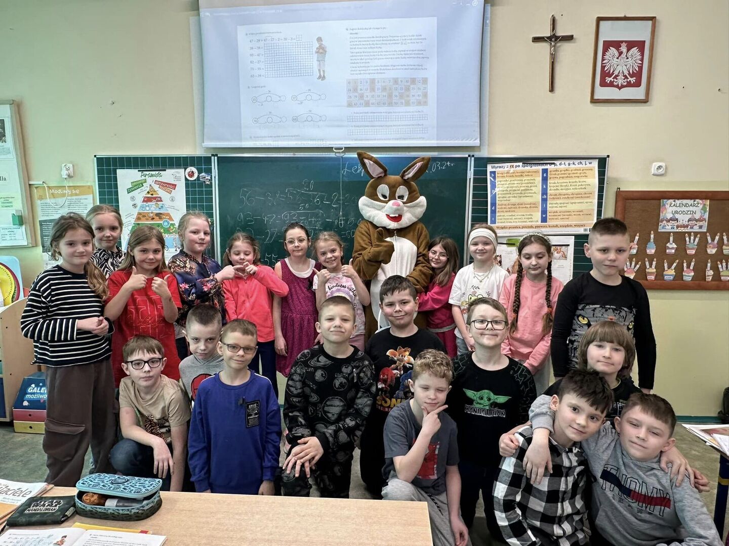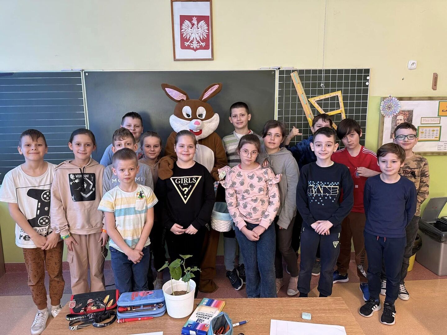 Już od dawna w naszym przedszkolu i szkole podstawowej panuje świąteczny klimat, dzięki deokracjom w klasach oraz zajęciom poświęconym tematyce Świąt Wielkanocnych. Jednak dzisiaj w murach naszej szkoły pojawił się wspaniały gość "Zajączek Wielkanocny"