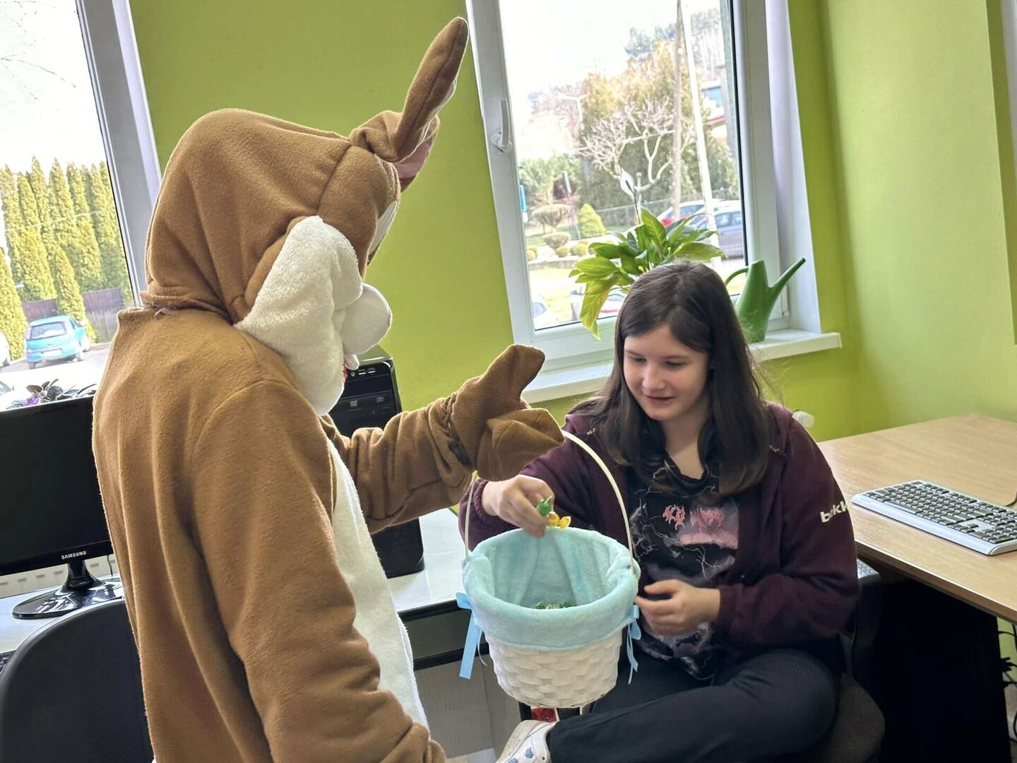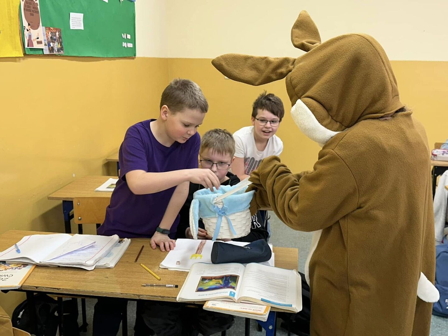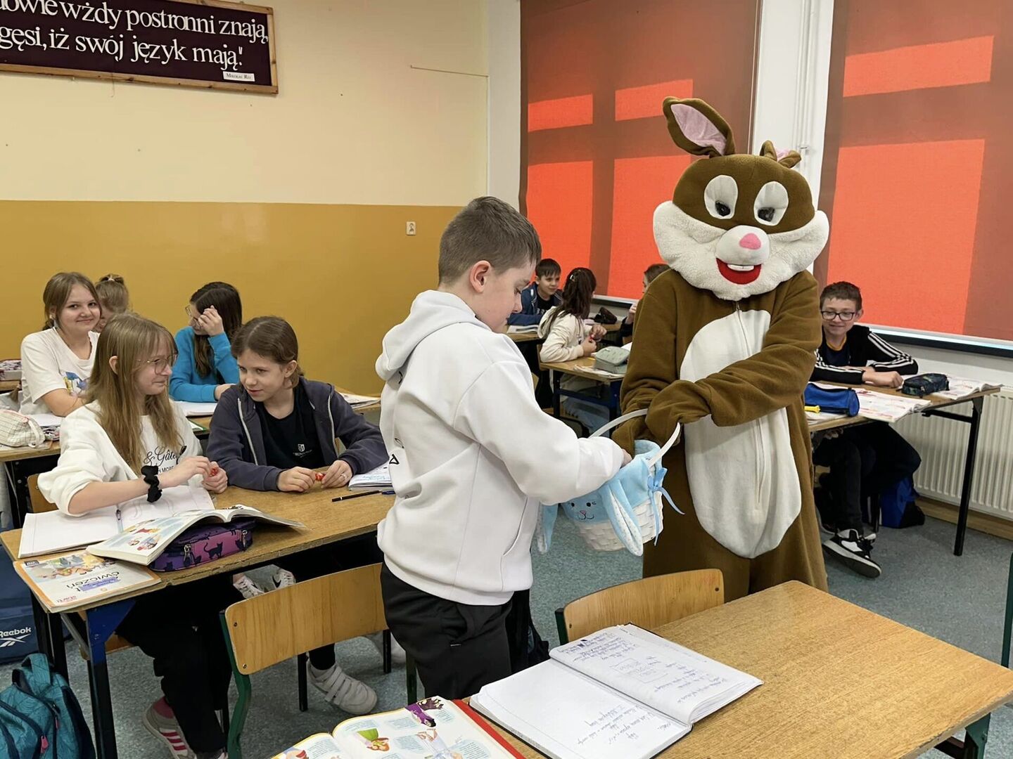 Zajączek odwiedzał wszystkie grupy i klasy częstując uczniów słodkościami, a nauczycielom życzył Wesołych Świąt