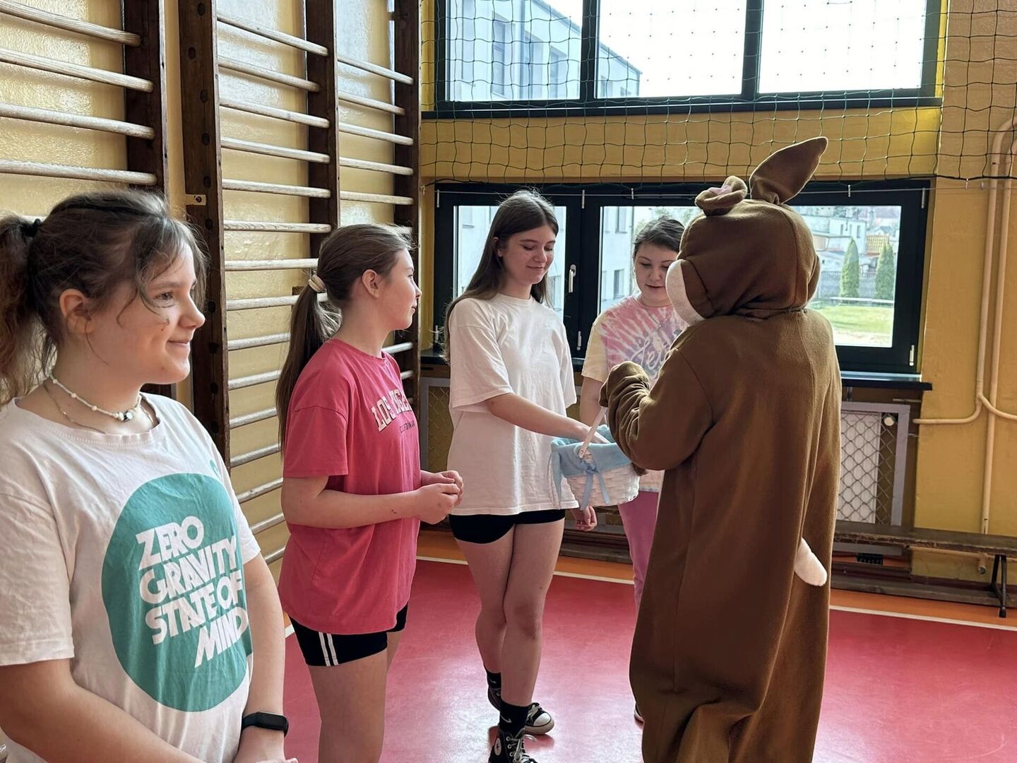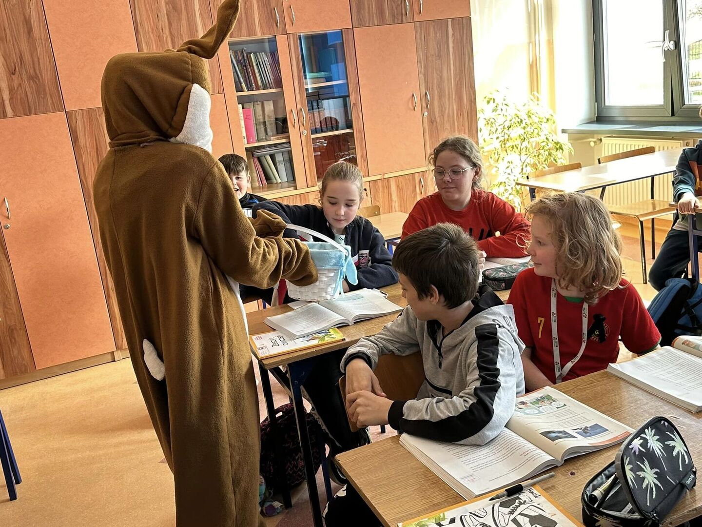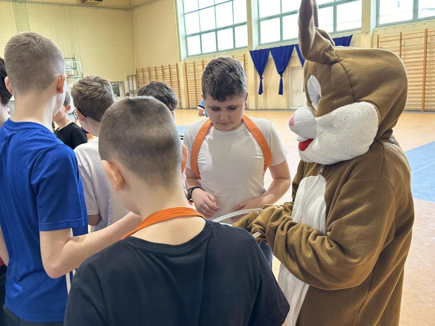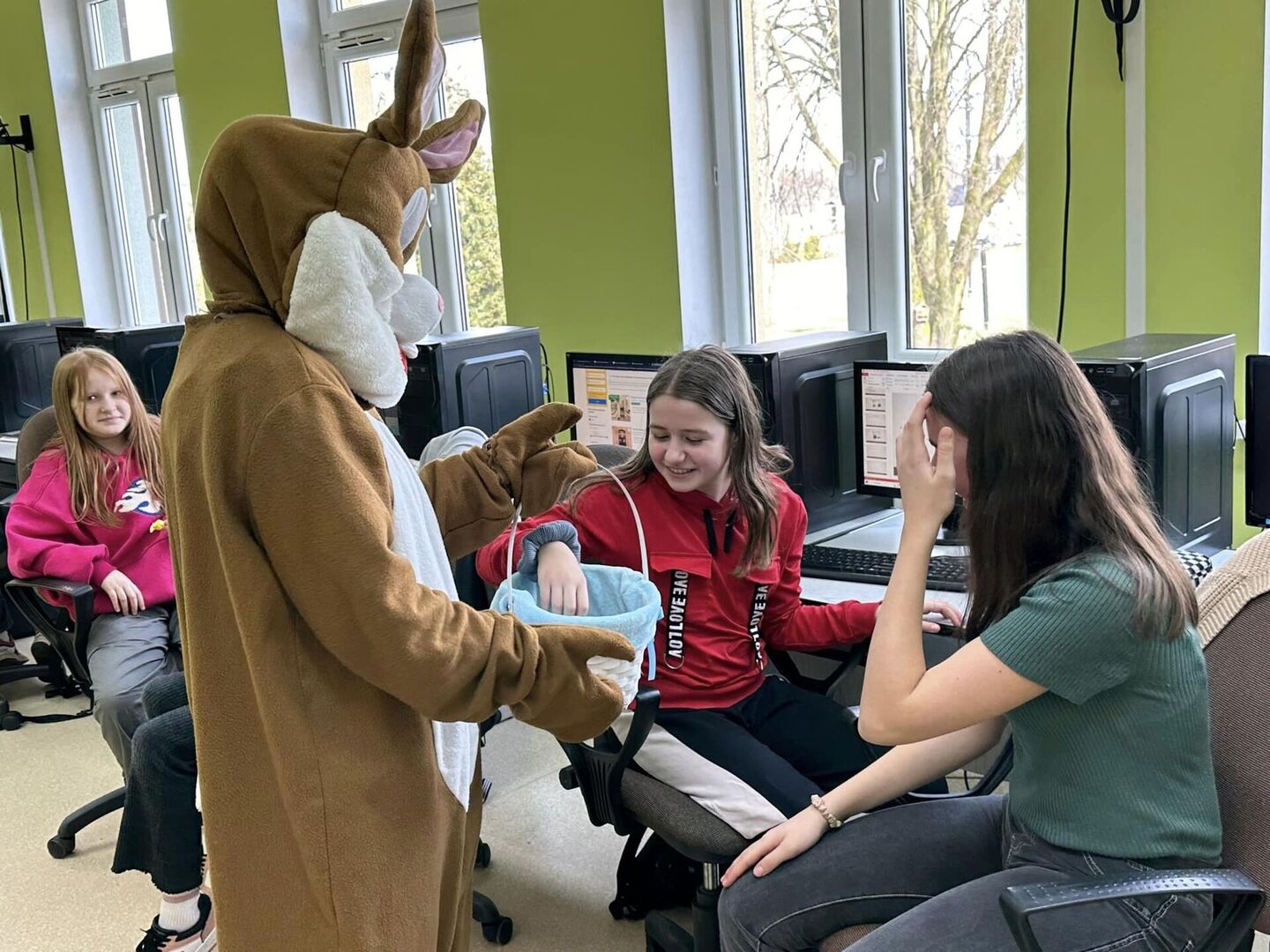 Zajączek odwiedzał wszystkie grupy i klasy częstując uczniów słodkościami, a nauczycielom życzył Wesołych Świąt