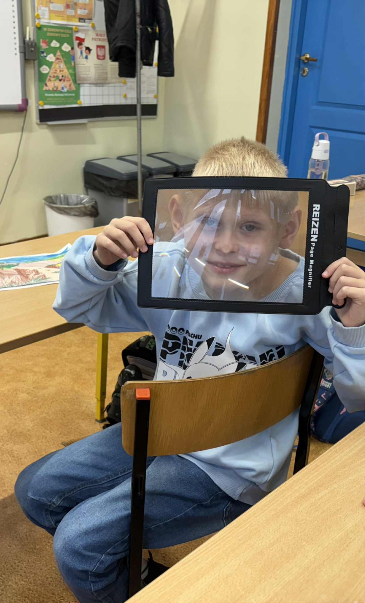 Pani Magda pokazała jak poruszać się z białą, długą laską, zademonstrowała pomoce z jakich korzysta - książki w alfabecie Braille'a, tablice i maszyny brajlowskie lupy, linijki powiększające, zeszyty z powiększoną liniaturą, książki dotykowe.
