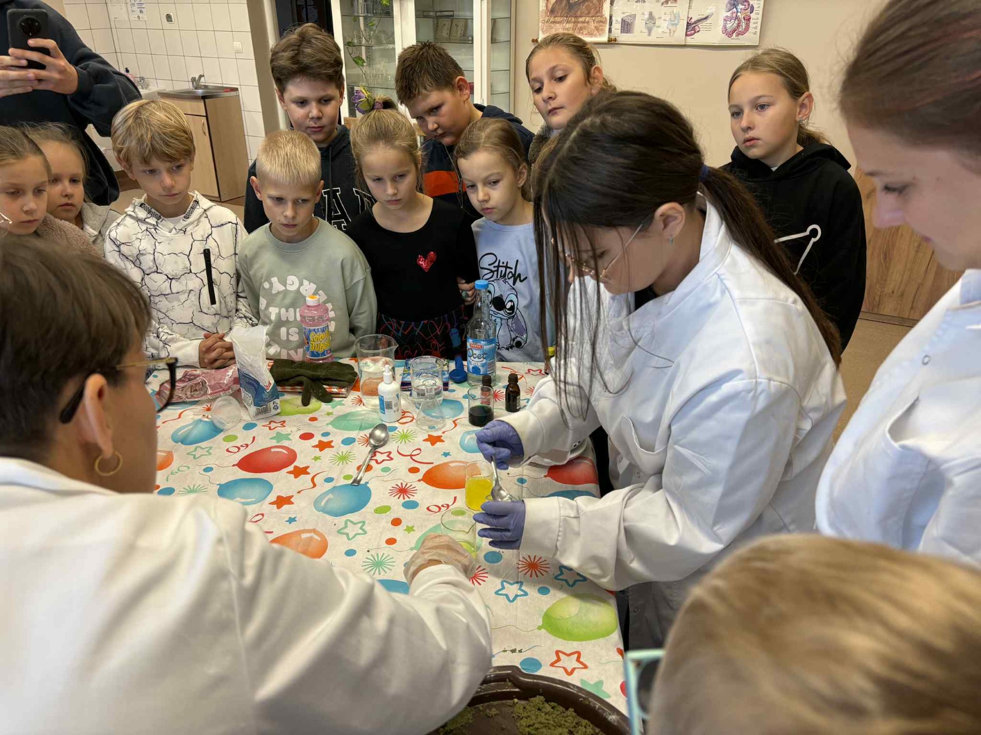 Trzecioklasiści brali udział w pokazach doświadczeń chemicznych w wykonaniu uczniów z Centrum Nauki Kurzętnik.