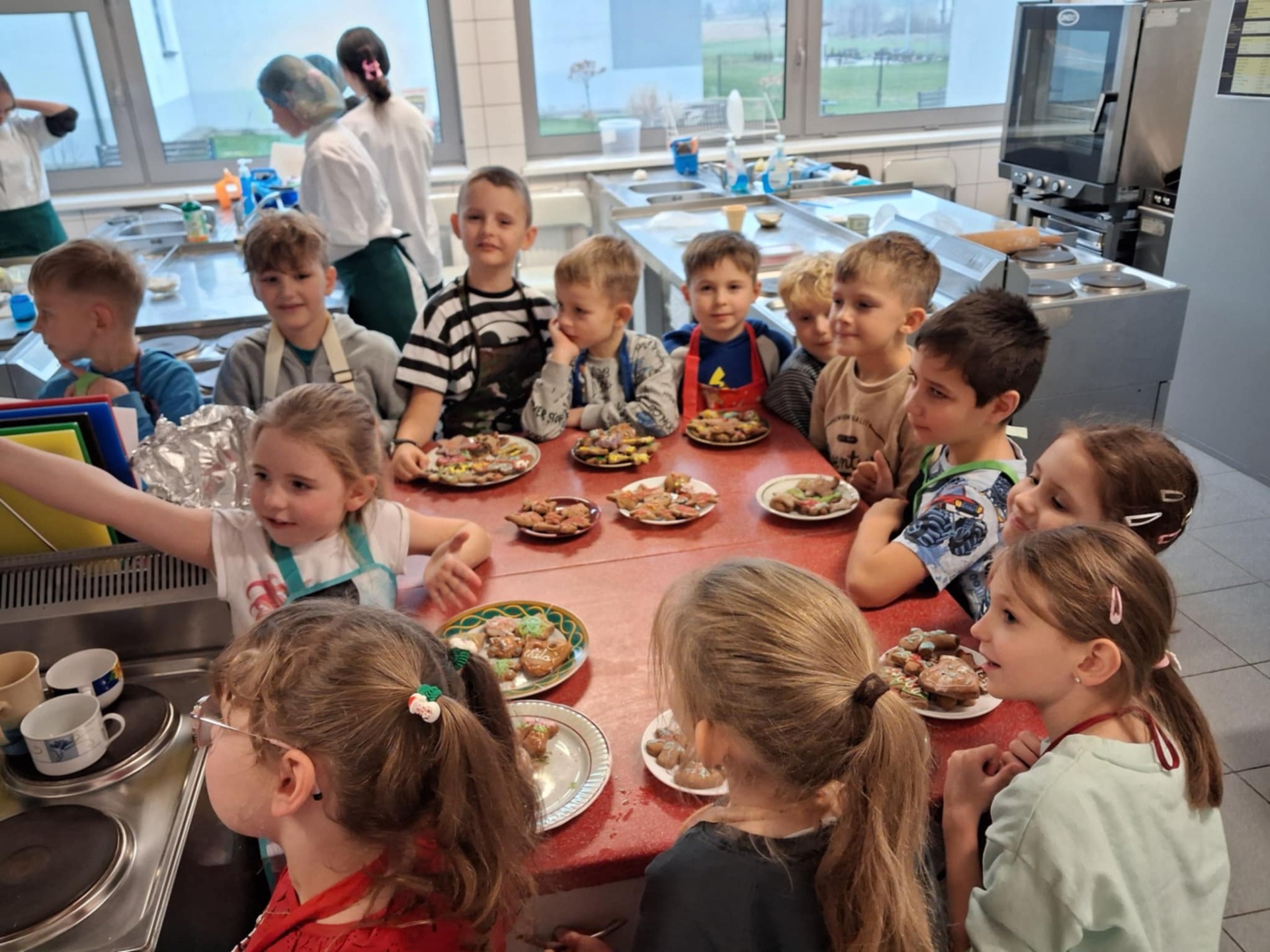 Dnia 25 listopada 2025r. w ramach zaproszenia pani Joanny Luftmann uczniowie klasy I a wybrali się do Zespołu Szkół Zawodowych w Kurzętniku. Dzieci uczestniczyły w kulinarnych zajęciach warsztatowych. Z pomocą starszych uczniów wałkowały ciasto i wykrawały pierniki różnych kształtów przy pomocy foremek. Wspaniały zapach unosił się w całej szkole. Najlepszą zabawą było dekorowanie ich z wykorzystaniem własnej inwencji twórczej.
